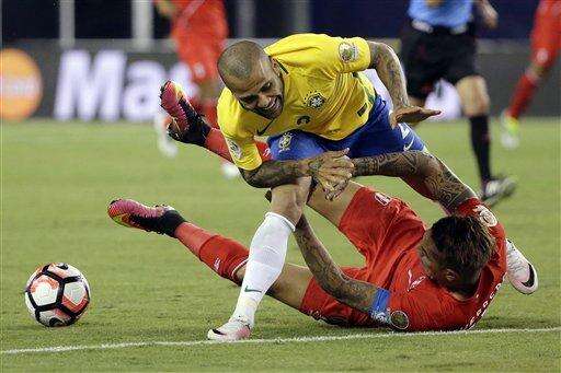 Brazil's Dani Alves, top, knocks down Peru's Paolo Guerrero during the first half of a Copa America Group B soccer match on Sunday, June 12, 2016, in Foxborough, Mass. (AP Photo/Steven Senne)