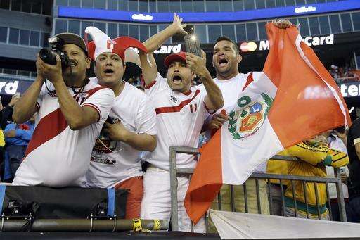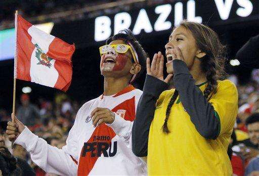 Supporters of Peru, left, and Brazil cheer their teams before a Copa America Group B soccer match on Sunday, June 12, 2016, in Foxborough, Mass. (AP Photo/Bill Sikes)