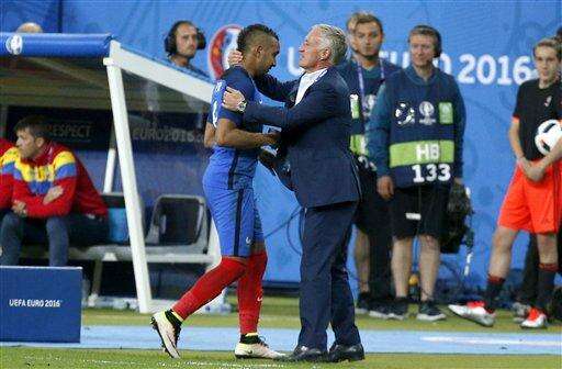 France coach Didier Deschamps hugs France's Dimitri Payet, left, as he leaves the pitch after being substituted during the Euro 2016 Group A soccer match between France and Romania, at the Stade de France, in Saint-Denis, north of Paris, Friday, June 10, 2016. (AP Photo/Thibault Camus) The Associated Press