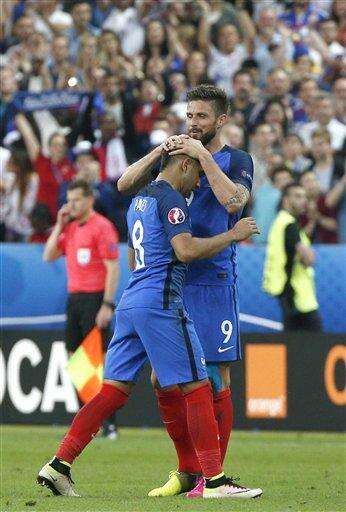 France's Olivier Giroud, right, hugs teammate Dimitri Payet as he leaves the pitch after being substituted during the Euro 2016 Group A soccer match between France and Romania, at the Stade de France, in Saint-Denis, north of Paris, Friday, June 10, 2016. (AP Photo/Thibault Camus) The Associated Press