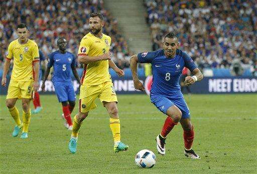 France's Dimitri Payet, right, runs with the ball during the Euro 2016 Group A soccer match between France and Romania, at the Stade de France, in Saint-Denis, north of Paris, Friday, June 10, 2016. (AP Photo/Thibault Camus) The Associated Press