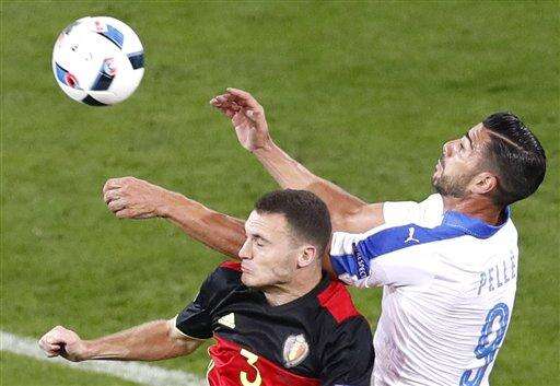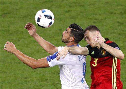 Italy's Graziano Pelle fights for the ball against Belgium's Thomas Vermaelen during the Euro 2016 Group E soccer match between Belgium and Italy at the Grand Stade in Decines-Charpieu, near Lyon, France, Monday, June 13, 2016. (AP Photo/Michael Sohn) The Associated Press