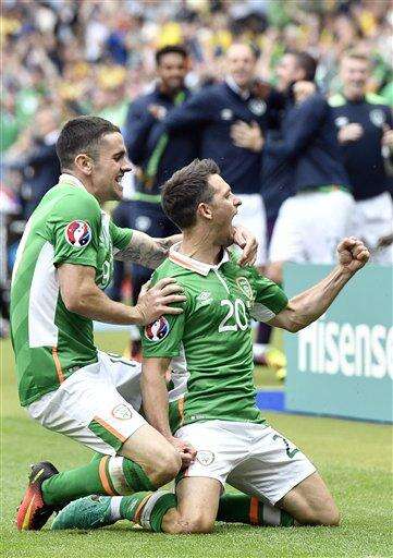 Republic of Ireland's Wes Hoolahan, right, celebrates after scoring the opening goal during the Euro 2016 Group E soccer match between Ireland and Sweden at the Stade de France in Saint-Denis, north of Paris, France, Monday, June 13, 2016. (AP Photo/Martin Meissner) The Associated Press