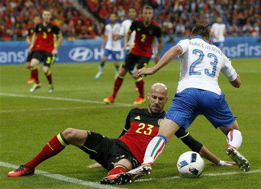 Belgium's Laurent Ciman, left, tackles Italy's Emanuele Giaccherini during the Euro 2016 Group E soccer match between Belgium and Italy at the Grand Stade in Decines-Charpieu, near Lyon, France, Monday, June 13, 2016. (AP Photo/Pavel Golovkin) The Associated Press