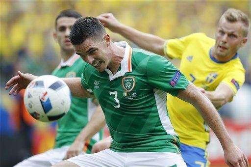 Ireland's Ciaran Clark scores an own goal during the Euro 2016 Group E soccer match between Ireland and Sweden at the Stade de France in Saint-Denis, north of Paris, France, Monday, June 13, 2016. (AP Photo/Christophe Ena) The Associated Press