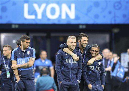 Italy goalkeeper Gianluigi Buffon, second from right, smiles with his teammates Lorenzo Insigne, right, and Ciro Immobile, second from left, as they attend an walk-around at the Grand Stade in Decines-Charpieu, near Lyon, France, Sunday, June 12, 2016. Italy will face Belgium in a Euro 2016 Group E soccer match in Lyon on Monday, June 13, 2016. (AP Photo/Antonio Calanni) The Associated Press
