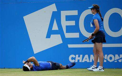Argentina's Juan Martin Del Potro lays on the court after a slip in his match against USA's John Isner during day three of the 2016 tennis Championships at The Queen's Club, London, Wednesday June 15, 2016. Isner defeated Del Potro 7-6 (2), 6-4. (Steve Paston/PA via AP) UNITED KINGDOM OUT The Associated Press