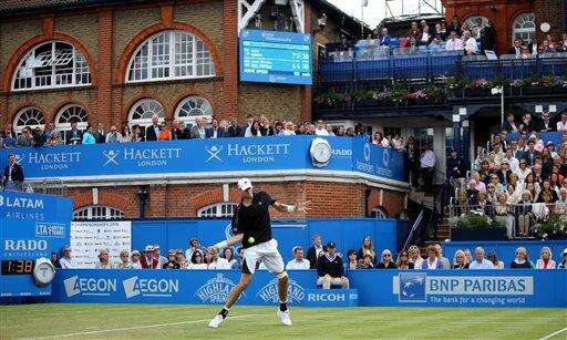 USA's John Isner prepares a return to Argentina's Juan Martin Del Potro during day three of the 2016 Championships at The Queen's Club, London, Wednesday June 15, 2016. Isner defeated Del Potro 7-6 (2), 6-4. (Steve Paston/PA via AP) UNITED KINGDOM OUT The Associated Press