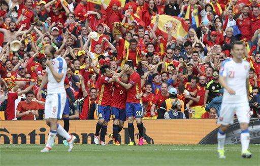 From left, Spain's David Silva, Andres Iniesta and Aritz Aduriz celebrate their side's 1-0 win at the end of the Euro 2016 Group D soccer match between Spain and the Czech Republic at the Stadium municipal in Toulouse, France, Monday, June 13, 2016. (AP Photo/Andrew Medichini) The Associated Press