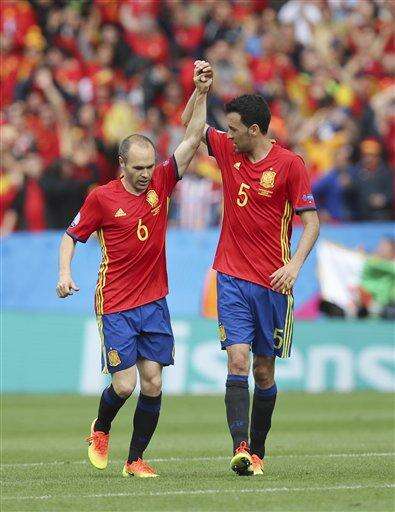 Spain's Andres Iniesta, left, and Sergio Busquets celebrate their side's 1-0 win at the end of the Euro 2016 Group D soccer match between Spain and the Czech Republic at the Stadium municipal in Toulouse, France, Monday, June 13, 2016. (AP Photo/Andrew Medichini) The Associated Press