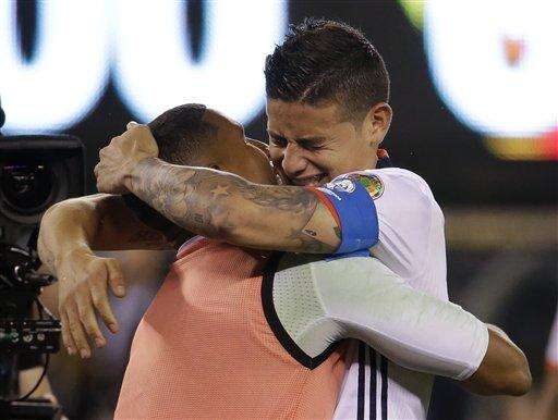 Colombia's James Rodriguez, right, celebrates with goalkeeper Cristian Bonilla (23) after Colombia beat Peru in a penalty shootout of a Copa America quarterfinal soccer match, Friday, June 17, 2016, in East Rutherford, N.J. (AP Photo/Julio Cortez) The Associated Press
