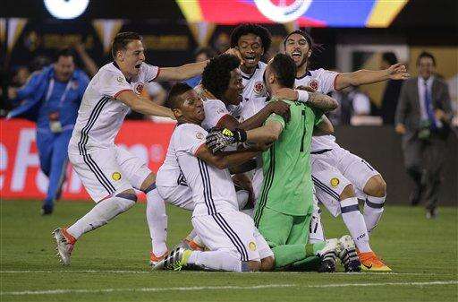 Colombia player celebrate their win over Peru in a Copa America Centenario quarterfinal soccer match, Friday, June 17, 2016, in East Rutherford, N.J. Colombia won in a shootout. (AP Photo/Peter Morgan) The Associated Press
