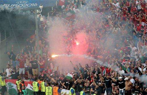 As Hungary's players celebrated the 88th-minute equalizer, Hungarian fans threw flares which landed on the field and among nearby police officers. Several loud bangs were heard and there was a cloud of smoke, delaying the restart.