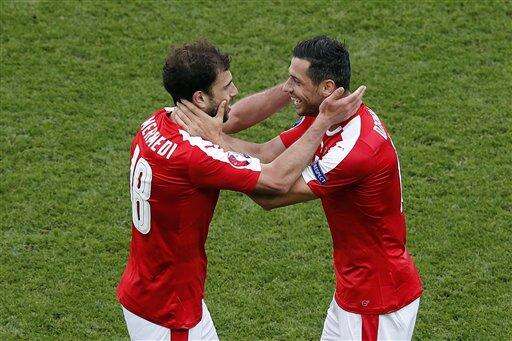 Switzerland's Admir Mehmedi, left, celebrates with his teammate Granit Xhaka after scoring his side's first goal during the Euro 2016 Group A soccer match between Romania and Switzerland at the Parc des Princes stadium in Paris, France, Wednesday, June 15, 2016. (AP Photo/Christophe Ena) The Associated Press