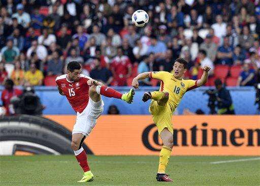 Switzerland's Blerim Dzemaili, left, goes for the ball with Romania's Andrei Prepelita during the Euro 2016 Group A soccer match between Romania and Switzerland at the Parc des Princes stadium in Paris, France, Wednesday, June 15, 2016. (AP Photo/Martin Meissner) The Associated Press