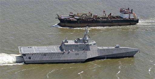 FILE - In this March 24, 2010, file photo, the littoral combat ship USS Independence, foreground, passes another vessel as it makes its way south through the waters of Mobile Bay, Ala. The Navy spent hundreds of millions of taxpayer dollars to fulfill its need for speed with the fast and agile warships like the Independence. The gee-whiz factor of the ships, designed to meet unconventional threats and to operate in shallow coastal waters, has been overshadowed by concerns over costs and survivability during combat. (G.M. Andrews/AL.com via AP) MAGS OUT; MANDATORY CREDIT The Associated Press