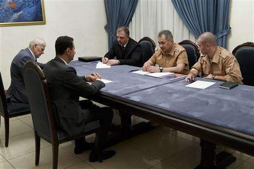 RETRANSMITTING FOR IMPROVED QUALITY Syrian President Bashar Assadleft, meets with Russian Defense Minister Sergei Shoigu, second right back, in Damascus, Syria, Saturday, June 18, 2016. Russia's defense minister visited Syria on Saturday to meet the country's leader and inspect the Russian air base there, a high-profile trip intended to underline Moscow's role in the region. (Vadim Savitsky/ Russian Defense Ministry Press Service pool photo via AP) The Associated Press
