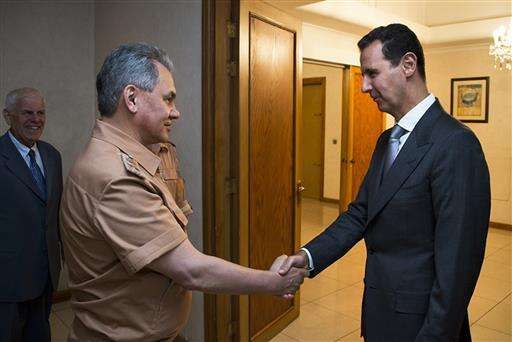RETRANSMITTING FOR IMPROVED QUALITY Syrian President Bashar Assad shakes hands with Russian Defense Minister Sergei Shoigu in Damascus, Syria, Saturday, June 18, 2016. Russia's defense minister visited Syria on Saturday to meet the country's leader and inspect the Russian air base there, a high-profile trip intended to underline Moscow's role in the region. (Vadim Savitsky/ Russian Defense Ministry Press Service pool photo via AP) The Associated Press