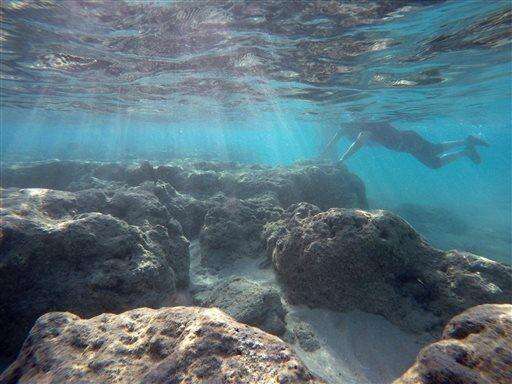 A man rests his hand on a dead reef as he snorkels in Oahu’s Hanauma Bay on Wednesday, May 6, 2016 near Honolulu. Much of the inner reef at Hanauma Bay is dead after decades of tourist interaction, but the outer reef is still relatively healthy. The International Coral Reef Symposium convenes Monday, June 20, 2016, to try to create a more unified conservation plan for coral reefs. (AP Photo/Caleb Jones) The Associated Press