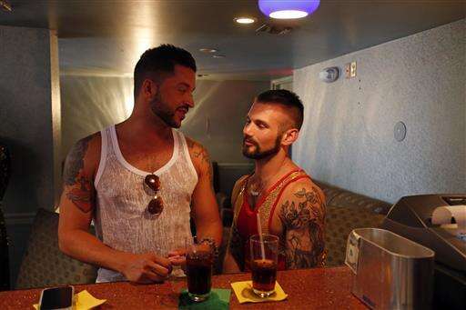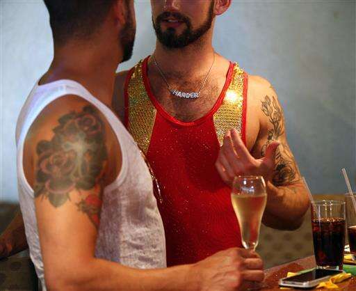 Jai Rodriguez and Chris Harder chat during a champagne toast to kick off "New Orleans Pride" festivities at Napoleon's Itch Bar in New Orleans, Saturday, June 18, 2016. (AP Photo/Gerald Herbert)