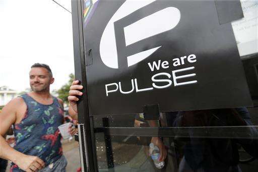 A sign with the logo of the Pulse nightclub hangs on the entrance as revelers for "New Orleans Pride" festivities enter Mags 940 Bar in New Orleans, Saturday, June 18, 2016. (AP Photo/Gerald Herbert)