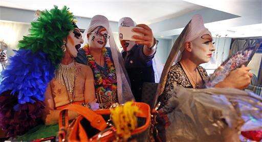 Revelers wait for a champagne toast to kick off "New Orleans Pride" festivities at Napoleon's Itch Bar in New Orleans, Saturday, June 18, 2016. (AP Photo/Gerald Herbert)