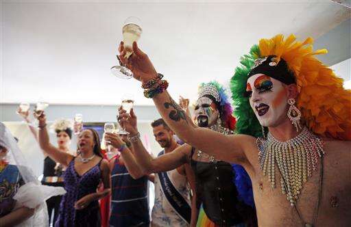 Revelers toast champagne to kick off "New Orleans Pride" festivities at Napoleon's Itch Bar in New Orleans, Saturday, June 18, 2016. (AP Photo/Gerald Herbert)