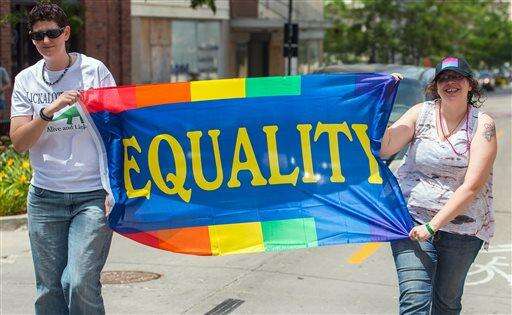 Dona Rives, left, and her wife of three years Jelyna Rives hold an equality flag during the St. Joseph Gay Pride parade on Saturday, June 18, 2016 in St. Joseph Missouri that ended at the Felix Street Square. "It makes us really want to show our support, it's sad that that is something we have to worry about," said Jelyna. When asked about the festival this year and how the Orlando shooting impacted it. "We try to come every year but felt it's important to come both days this year and show our support and that we are a community and we are here for each other." (Dougal Brownlie/The St. Joseph News-Press via AP) MANDATORY CREDIT