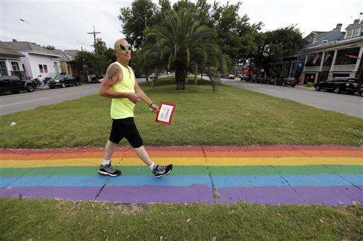 A revelers for "New Orleans Pride" festivities walks across a rainbow painted sidewalk in New Orleans, Saturday, June 18, 2016. (AP Photo/Gerald Herbert)
