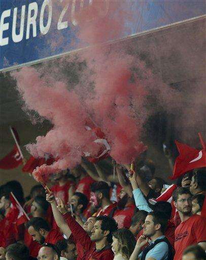In the match against Spain, Turkey's fans turned on captain Arda Turan, booing him when he played the ball. They also used flares and a smoke bomb in the stands and repeatedly threw firecrackers onto the field after the final whistle.