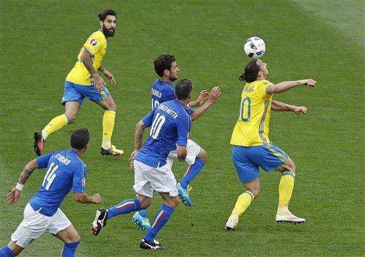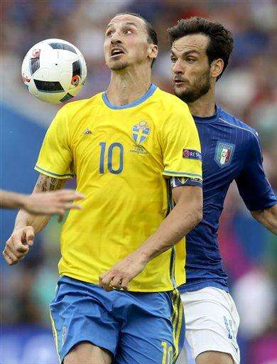 Sweden's Zlatan Ibrahimovic, right, controls the ball during the Euro 2016 Group E soccer match between Italy and Sweden at the Stadium municipal in Toulouse, France, Friday, June 17, 2016. (AP Photo/Hassan Ammar) The Associated Press