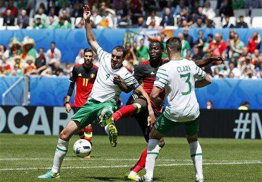 Belgium's Romelu Lukaku,center, fights for the ball with Ireland's John O'Shea during the Euro 2016 Group E soccer match between Belgium and Ireland at the Nouveau Stade in Bordeaux, France, Saturday, June 18, 2016. (AP Photo/Hassan Ammar) The Associated Press