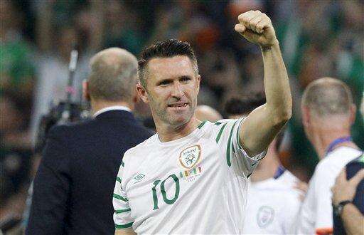Ireland's Robbie Keane celebrates at the end of the Euro 2016 Group E soccer match between Italy and Ireland at the Pierre Mauroy stadium in Villeneuve d’Ascq, near Lille, France, Wednesday, June 22, 2016. Ireland won 1-0. (AP Photo/Antonio Calanni) The Associated Press