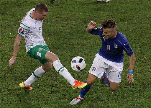 Ireland's Glenn Whelan fights for the ball against Italy's Ciro Immobile during the Euro 2016 Group E soccer match between Italy and Ireland at the Pierre Mauroy stadium in Villeneuve d’Ascq, near Lille, France, Wednesday, June 22, 2016. (AP Photo/Darko Vojinovic) The Associated Press
