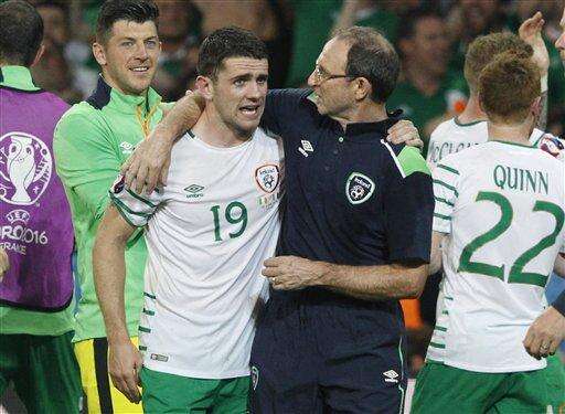 Ireland coach Martin O'Neill hugs Robbie Brady as they celebrate at the end of the Euro 2016 Group E soccer match between Italy and Ireland at the Pierre Mauroy stadium in Villeneuve d’Ascq, near Lille, France, Wednesday, June 22, 2016. Ireland won 1-0. (AP Photo/Antonio Calanni) The Associated Press