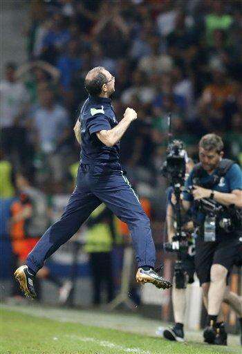 Ireland's coach Martin O'Neill celebrates after Ireland's Robbie Brady scored a goal during the Euro 2016 Group E soccer match between Italy and Ireland at the Pierre Mauroy stadium in Villeneuve d’Ascq, near Lille, France, Wednesday, June 22, 2016. (AP Photo/Frank Augstein) The Associated Press