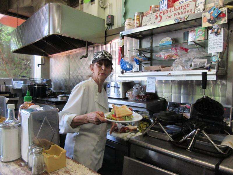 Cynde Foster prepares a sandwich from behind the counter at Jimmy T's Place, an old-school diner that's been open for decades in the Capitol Hill neighborhood of Washington, D.C. Associated Press