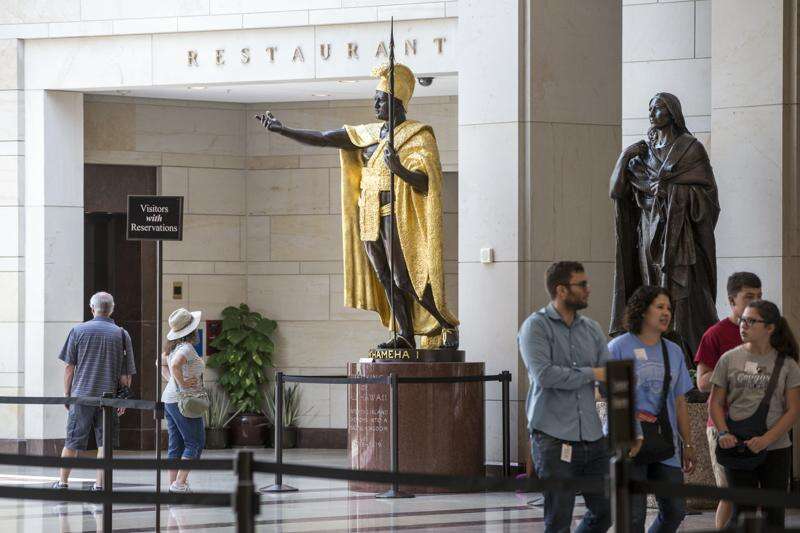 Tourists pass beneath the towering bronze statue of King Kamehameha, the 18th century Hawaiian warrior-monarch, at the Capitol Visitor Center in Washington. Associated Press