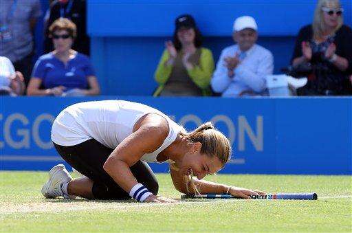 Slovakia's Dominika Cibulkova celebrates her victory over Czech Republic's Karolina Pliskova during day six of the Eastbourne International women's tennis tournament at Devonshire Park, Eastbourne England, Saturday, June 25, 2016. (Gareth Fuller/PA via AP) UNITED KINGDOM OUT - NO SALES - NO ARCHIVES The Associated Press