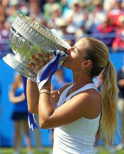 Slovakia's Dominika Cibulkova kisses the trophy after victory over Czech Republic's Karolina Pliskova during day six of the Eastbourne International women's tennis tournament at Devonshire Park, Eastbourne England, Saturday, June 25, 2016. (Gareth Fuller/PA via AP) UNITED KINGDOM OUT - NO SALES - NO ARCHIVES The Associated Press
