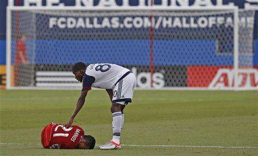 FC Dallas midfielder Michael Barrios (21) lays on the ground after a collision and is checked by Real Salt Lake forward Olmes Garcia (80) during the first half of an MLS soccer game in Frisco, Texas, Saturday, June 25, 2016. (Stewart F. House/The Dallas Morning News via AP) MANDATORY CREDIT