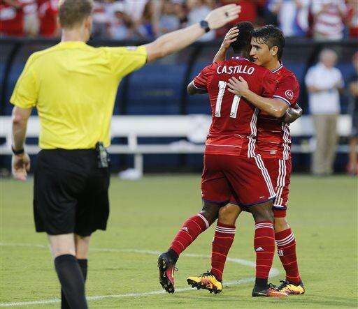 FC Dallas forward Fabian Castillo (11) is embraced by midfielder Mauro Diaz (10) after Castillo scored a goal during the second half of an MLS soccer game against Real Salt Lake FC in Frisco, Texas, Saturday, June 25, 2016. (Stewart F. House/The Dallas Morning News via AP) MANDATORY CREDIT