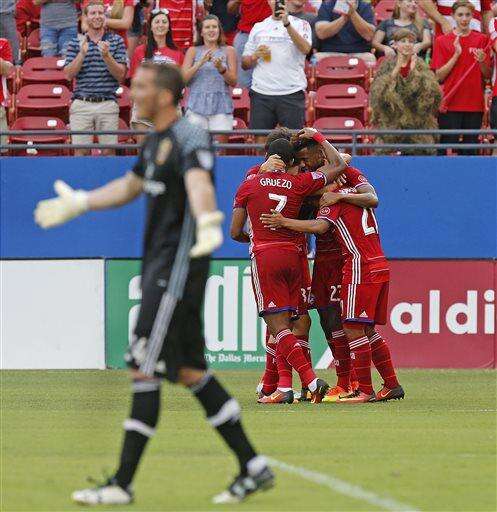 FC Dallas midfielder Kellyn Acosta (23) is mobbed by teammates after scoring on Real Salt Lake goalkeeper Jeff Attinella (24) who reacts to the goal during the first half of an MLS soccer game in Frisco, Texas, Saturday, June 25, 2016. (Stewart F. House/The Dallas Morning News via AP) MANDATORY CREDIT