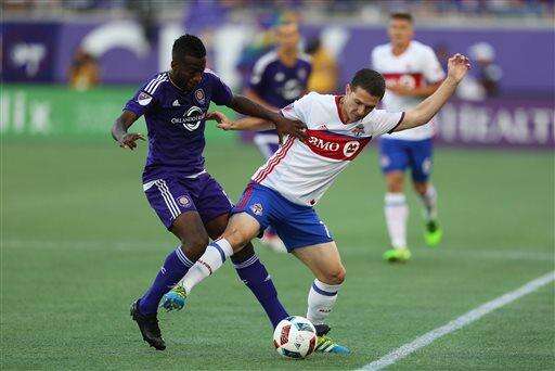 Orlando City midfielder Adrian Winter, right, goes after the ball during an MLS soccer game against Toronto FC Saturday, June 25, 2016, in Orlando, Fla. (Ricardo Ramirez Buxeda/Orlando Sentinel via AP) MAGAZINES OUT; NO SALES; MANDATORY CREDIT