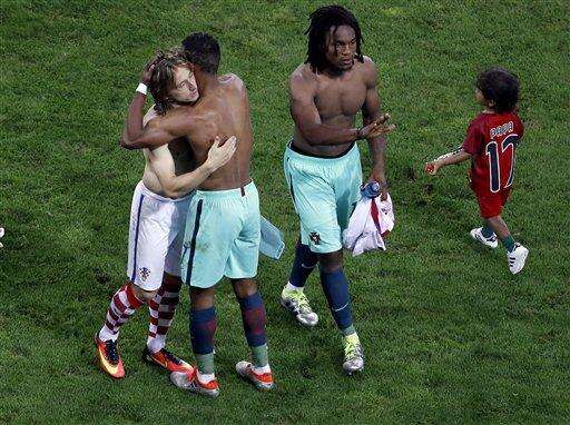 Croatia's Luka Modric, left, hugs Portugal's Nani, 2nd left, after the Euro 2016 round of 16 soccer match between Croatia and Portugal at the Bollaert stadium in Lens, France, Saturday, June 25, 2016. Portugal defeated Croatia by 1-0. (AP Photo/Darko Vojinovic) The Associated Press