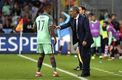Nani's coach Fernando Santos was fulsome in his praise of the winger as he reached a career milestone.