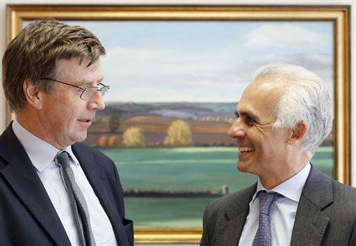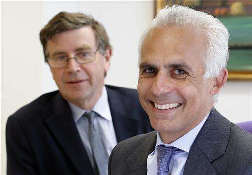 In this photo taken on Friday, June 3, 2016, Ben Habib, CEO of First Property Group, right, and George Digby, the company's group finance director pose for a photo at their office in London. The British were warned for weeks that a vote to leave the European Union would result in economic pain. Now they’ll find out. The pound plunged to its lowest level in over 30 years on Friday, raising concerns about price inflation, and shares in the U.K.’s biggest banks and real estate builders posted double-digit declines as economists predicted the country would fall into recession. (AP Photo/Frank Augstein) The Associated Press