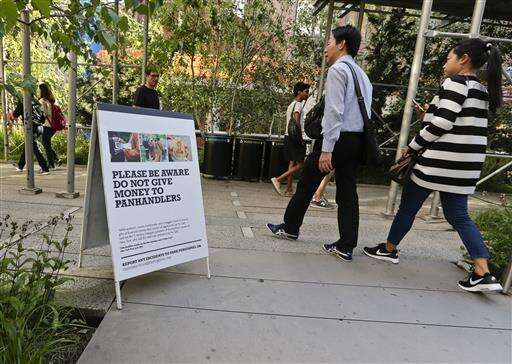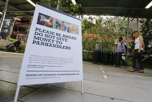 A few days after the AP inquired about the men on the High Line, several signs were posted there with photos of them, warning visitors not to give money to panhandlers.