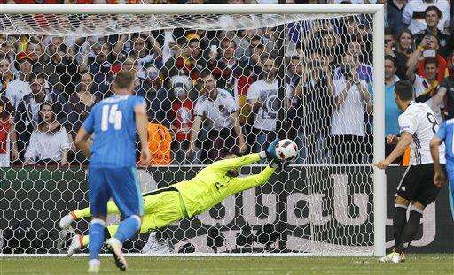 Slovakia goalkeeper Matus Kozacik saves a penalty kicked by Germany's Mesut Ozil during the Euro 2016 round of 16 soccer match between Germany and Slovakia, at the Pierre Mauroy stadium in Villeneuve d'Ascq, near Lille, France, Sunday, June 26, 2016. (AP Photo/Frank Augstein) The Associated Press