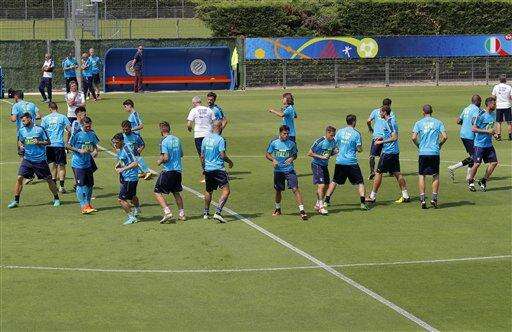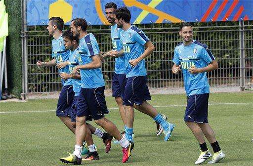 Italy players attend a training session at the Bernard Gasset center in Montpellier, France, Wednesday, June 29, 2016. Italy will face Germany in a Euro 2016 quarter final soccer match in Bordeaux on Saturday, July 2, 2016. (AP Photo/Antonio Calanni) The Associated Press